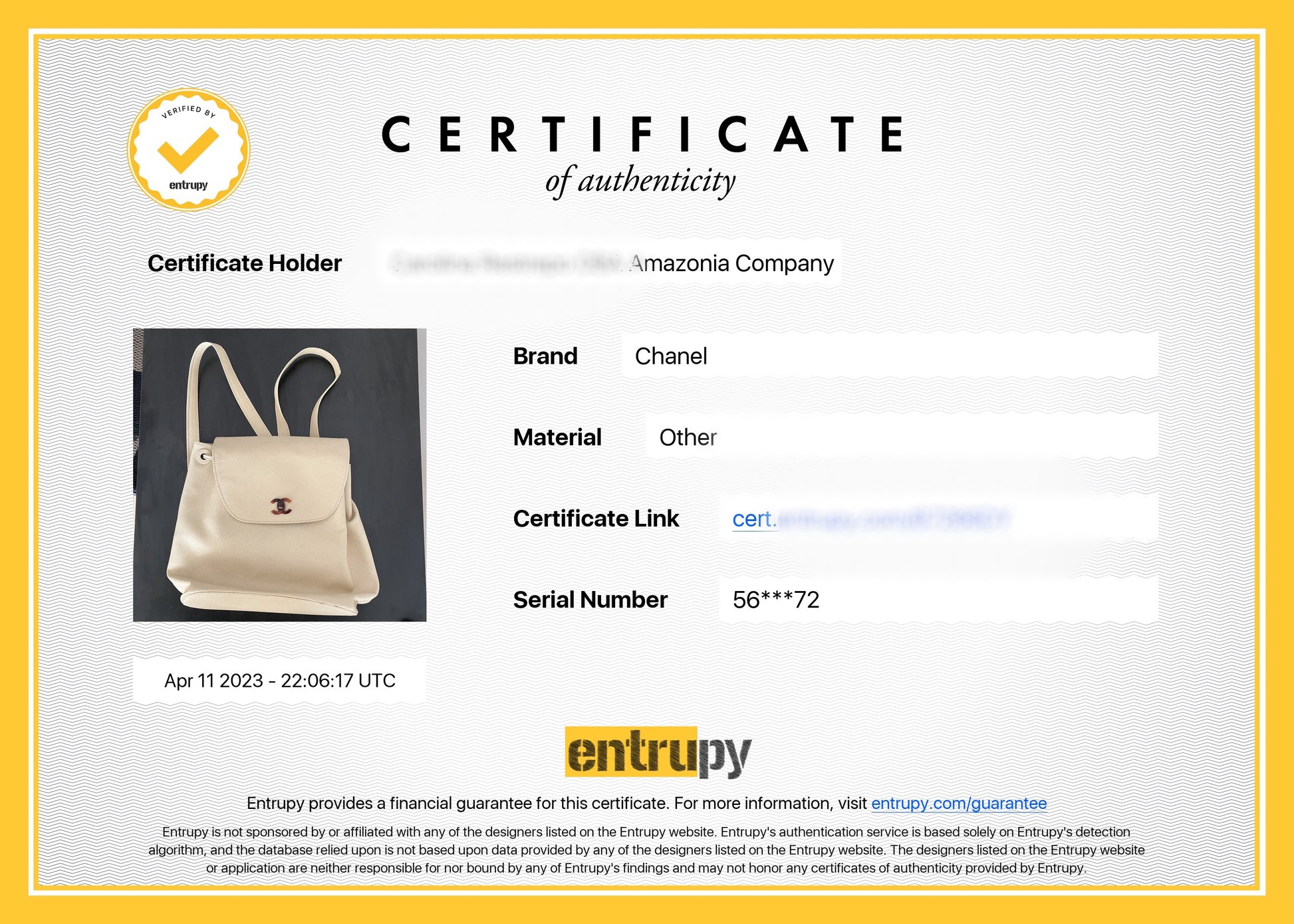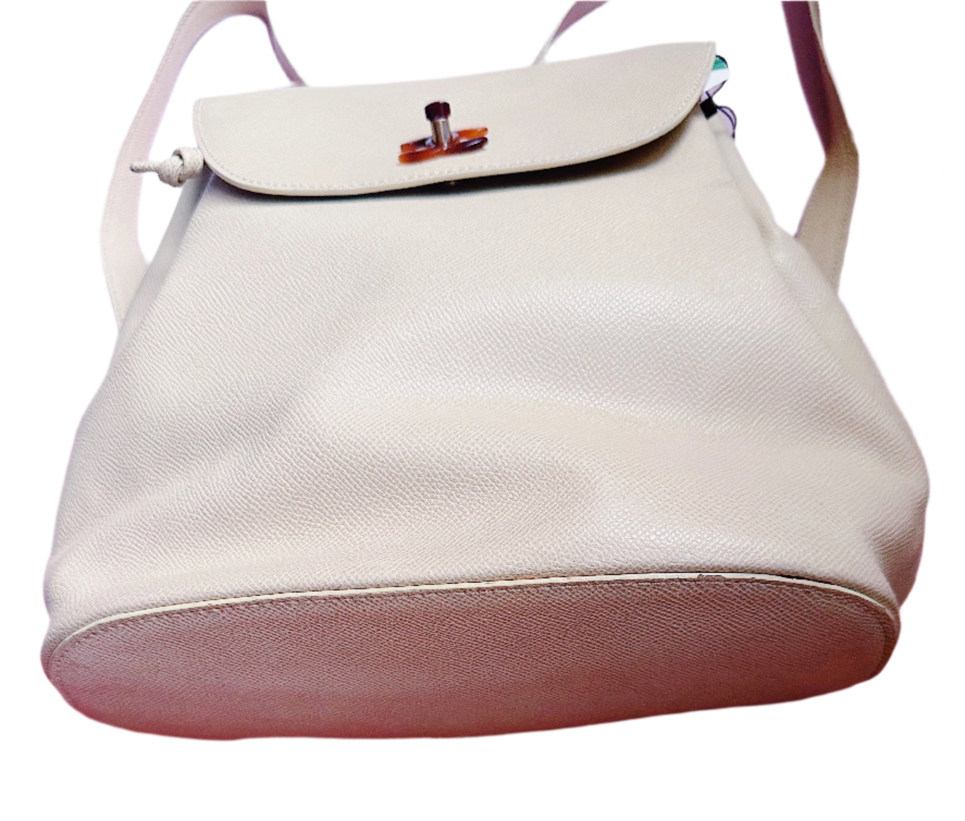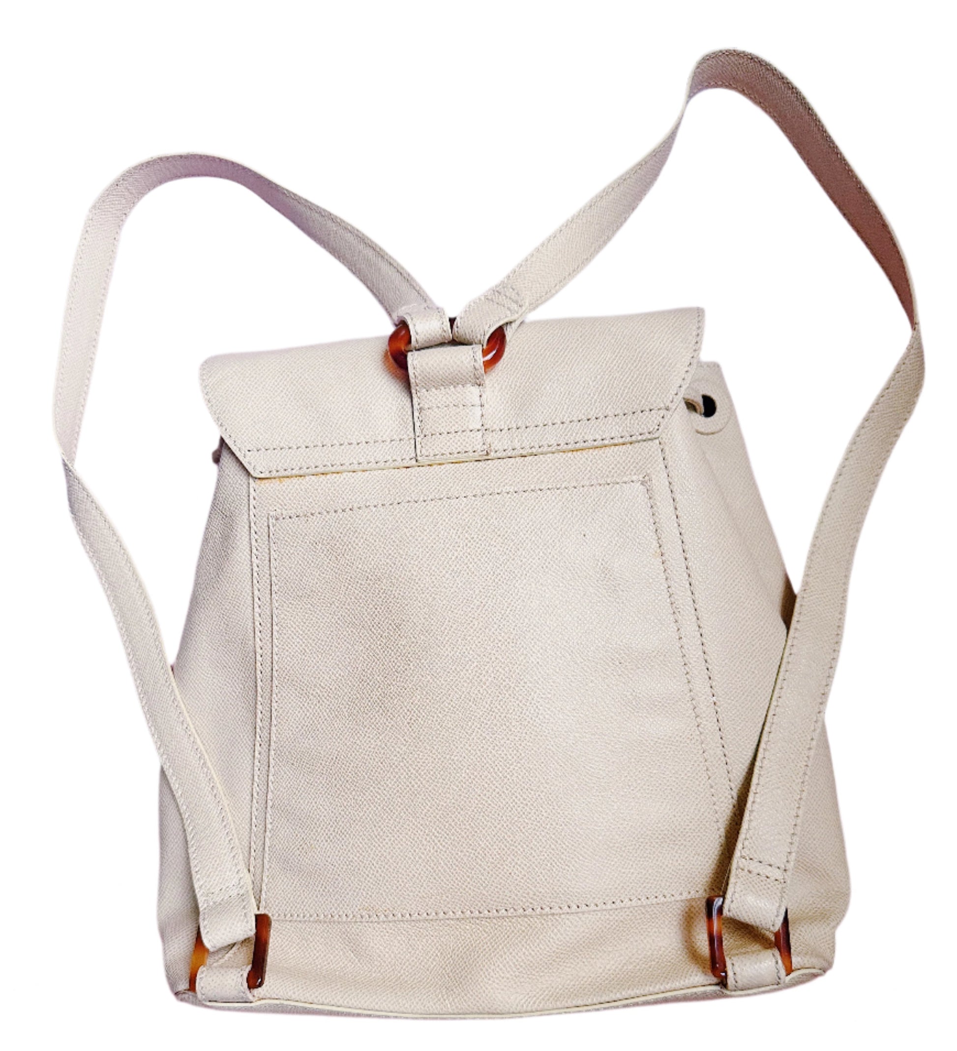 It is a rectangular backpack in Beige caviar leather with leather non-adjustable straps, and tortoishell logo and accents. It comes with an internal zipper pocket with the brand's logo on its pull, hologram and serial number inside as well.