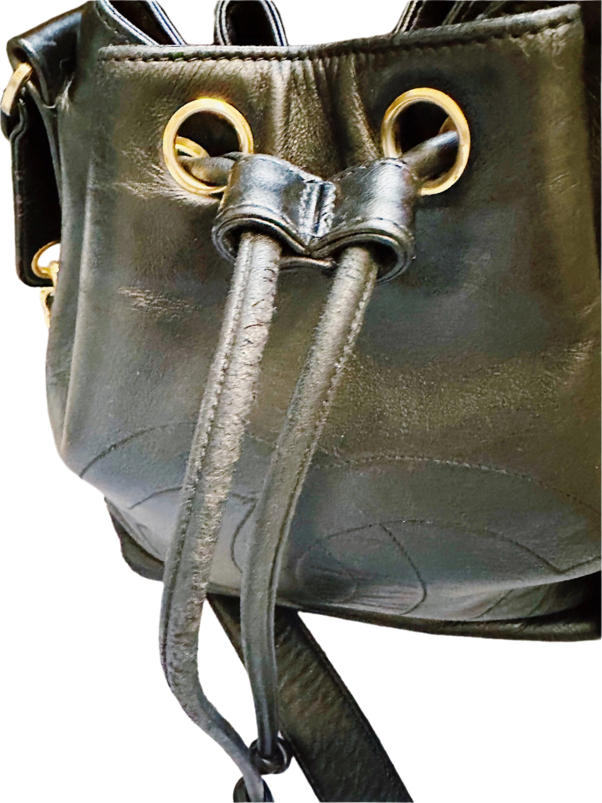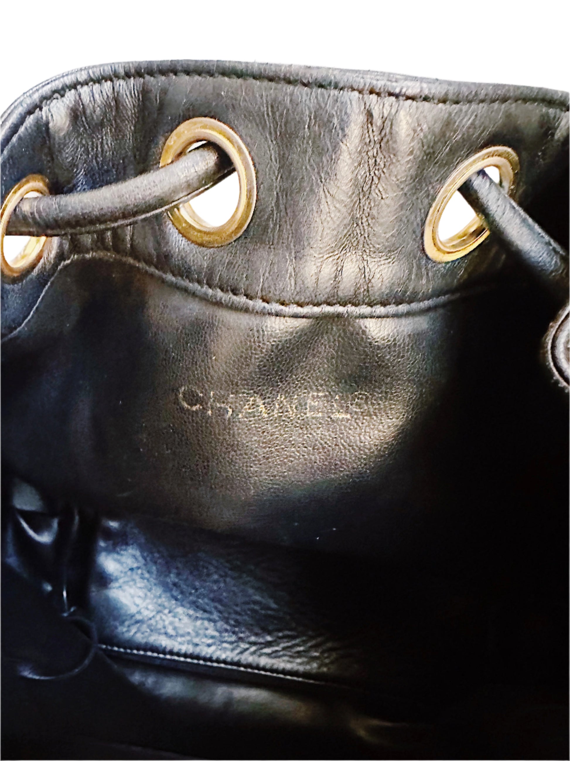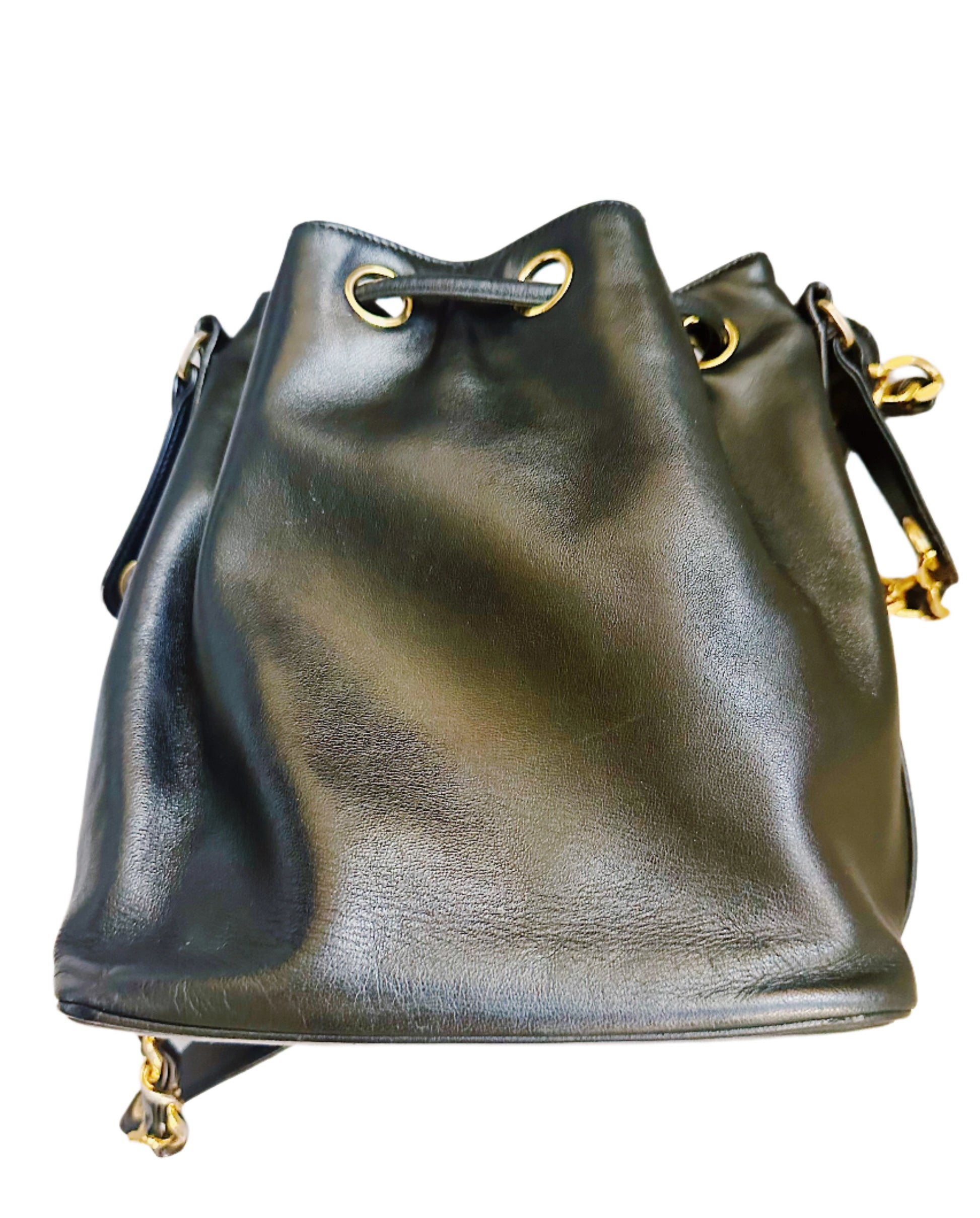 This exquisite Vintage Chanel Bucket Bag is a true collector's item. Crafted from luxurious black leather and designed by the legendary Karl Lagerfeld, it features gold tone hardware and a single shoulder strap for easy carrying. The iconic interlocking CC logo is engraved on the front, adding an unmistakable touch of elegance. The spacious interior is lined with leather and features a drawstring closure at the top.