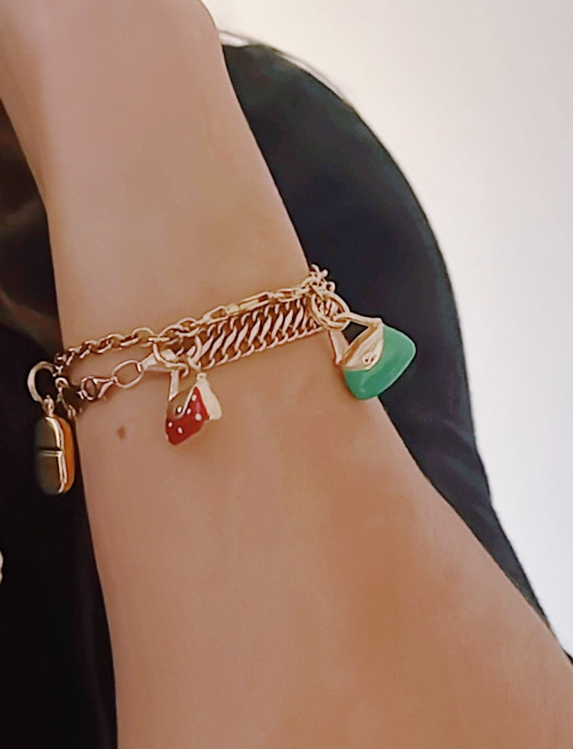 Make a statement with our Charm Enamel Bracelet, perfect for adding a touch of vintage charm to your outfit. Featuring adorable shoes and bags charms, this link bracelet is made from 14 carat Italian yellow gold and is sure to catch the eye. The multi-color enamel finish adds a fun and playful touch to this eye-catching piece of jewelry. Whether you wear it alone or stack it with other bracelets, this Charm Enamel Bracelet is a must-have for any fashion-forward jewelry collection.